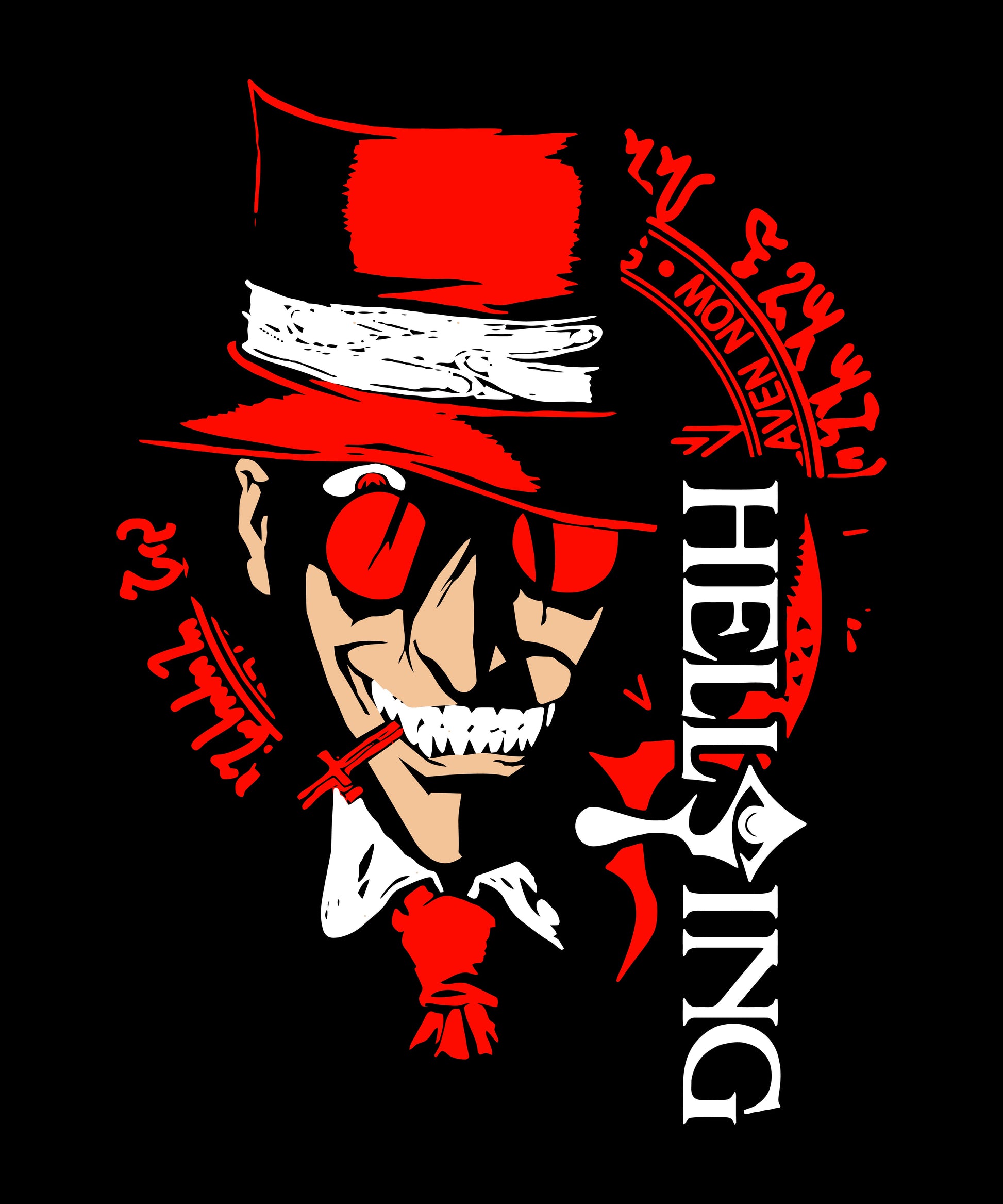 - Design: Bold, detailed print featuring Alucard in a stylized illustration from Hellsing. The design includes his signature red attire and glowing red glasses, with cryptic symbols and the word "HELLSING" in sharp, angular fonts.
