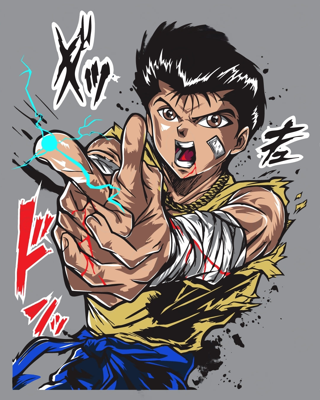 - Color: A gray background with vibrant, high-quality prints of Yusuke in action, emphasizing his iconic outfit and intense expression.