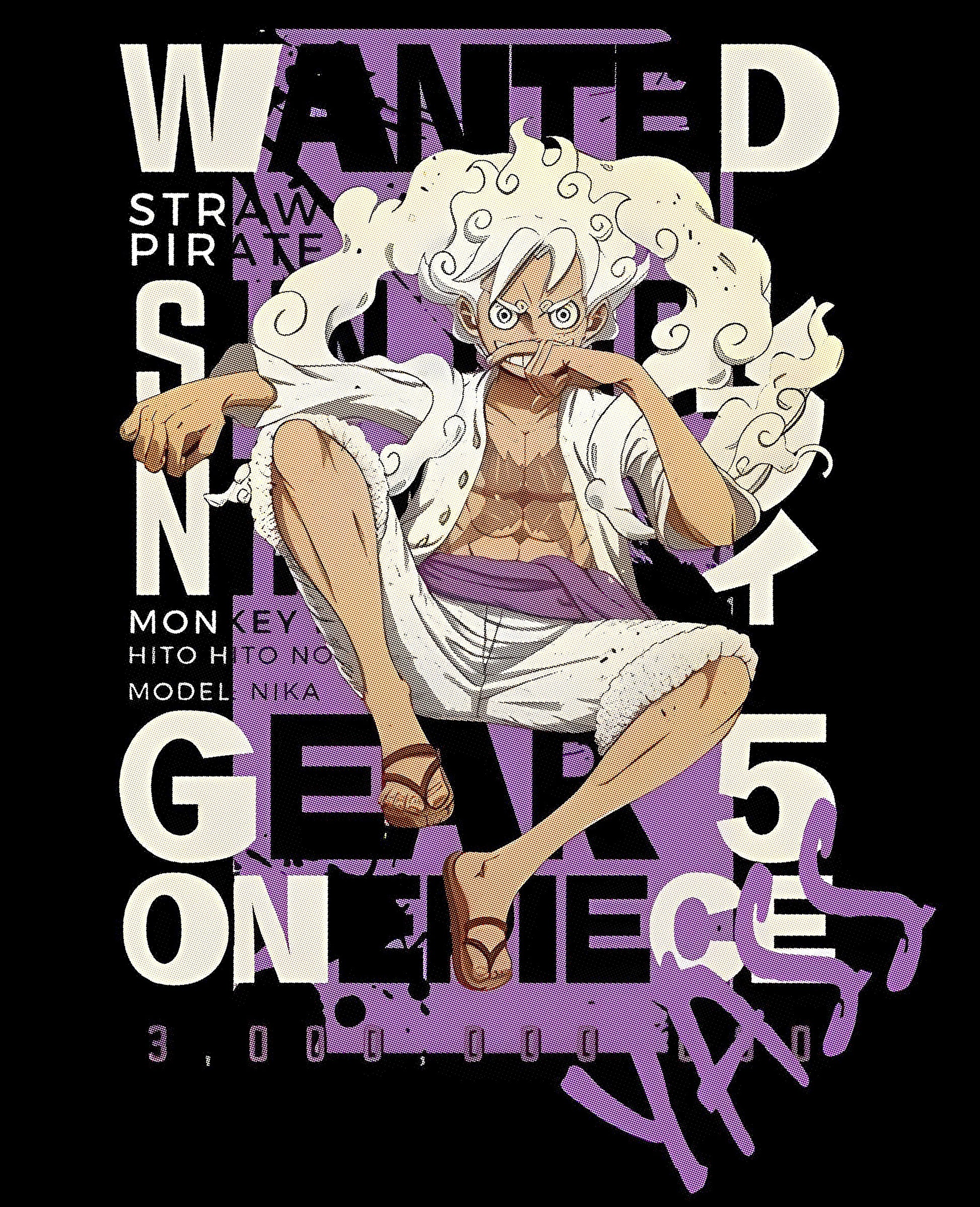 Description: Dive deep into the adventure with our "Monkey D. Luffy Gear 5" apparel, showcasing the fearless captain of the Straw Hat Pirates in his electrifying Gear 5 transformation. This vibrant design features Luffy in his iconic pose, surrounded by dynamic effects that capture the essence of his boundless energy and pirate spirit. The background is adorned with striking purple and white text, enhancing the pirate-themed aesthetic.