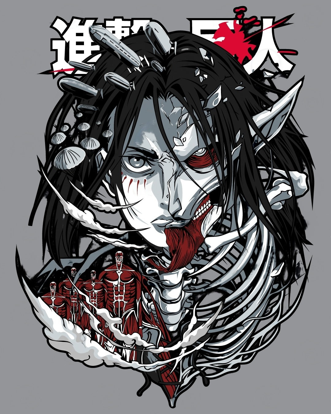 Unleash the fury of Eren Yeager with this dynamic apparel from "Attack on Titan." The design vividly depicts Eren in his powerful Titan form, encapsulated in a dramatic swirl of shattering bones and intense expressions. This striking piece embodies the transformation and raw power that Eren represents in the series.