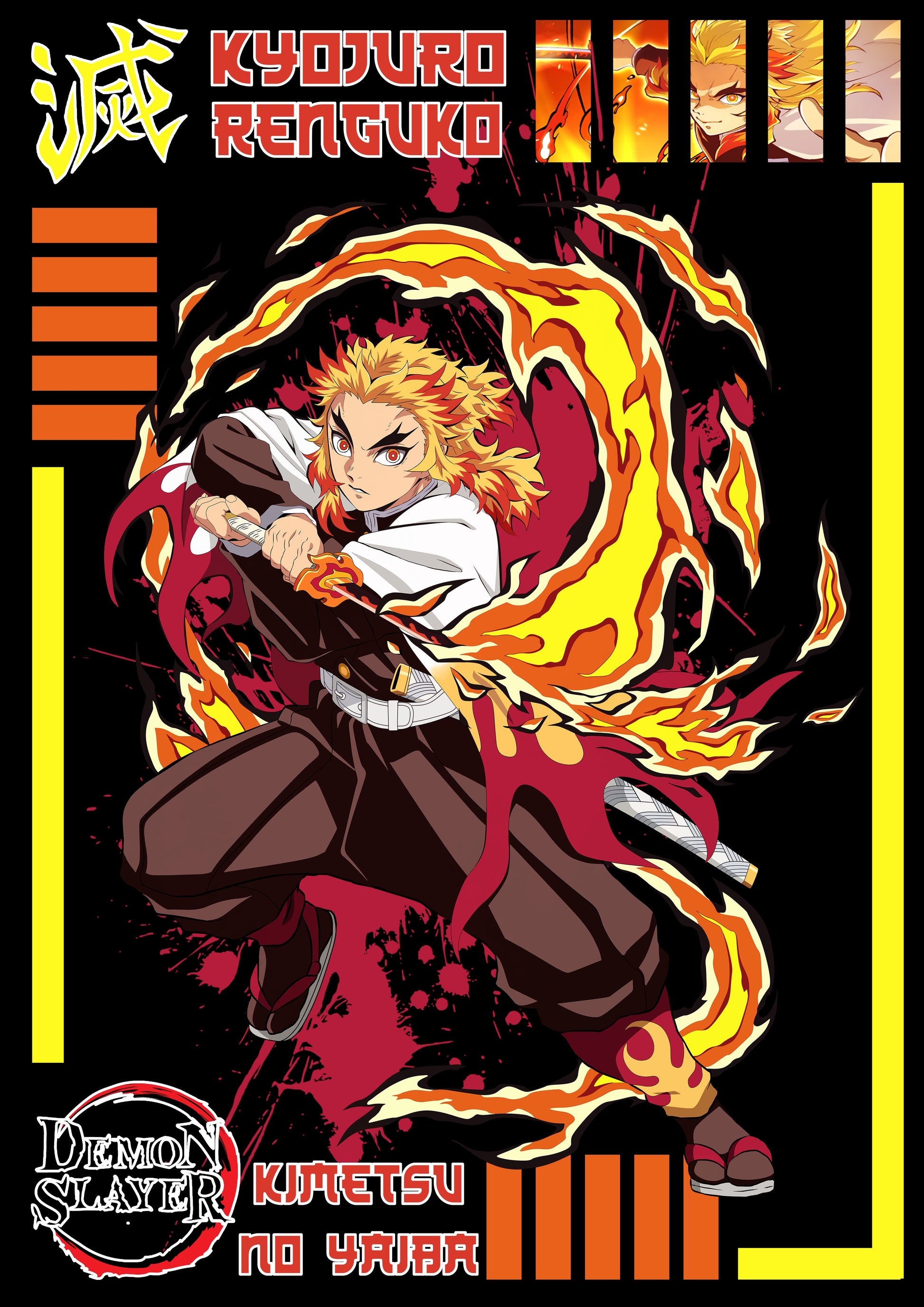 Ignite your wardrobe with the fiery spirit of Kyojuro Rengoku from "Demon Slayer: Kimetsu no Yaiba." This striking design captures the Flame Hashira in action, surrounded by fierce flames that symbolize his burning resolve and indomitable courage. A vibrant blend of red and yellow hues against a stark black background makes this apparel a bold statement piece for any fan.