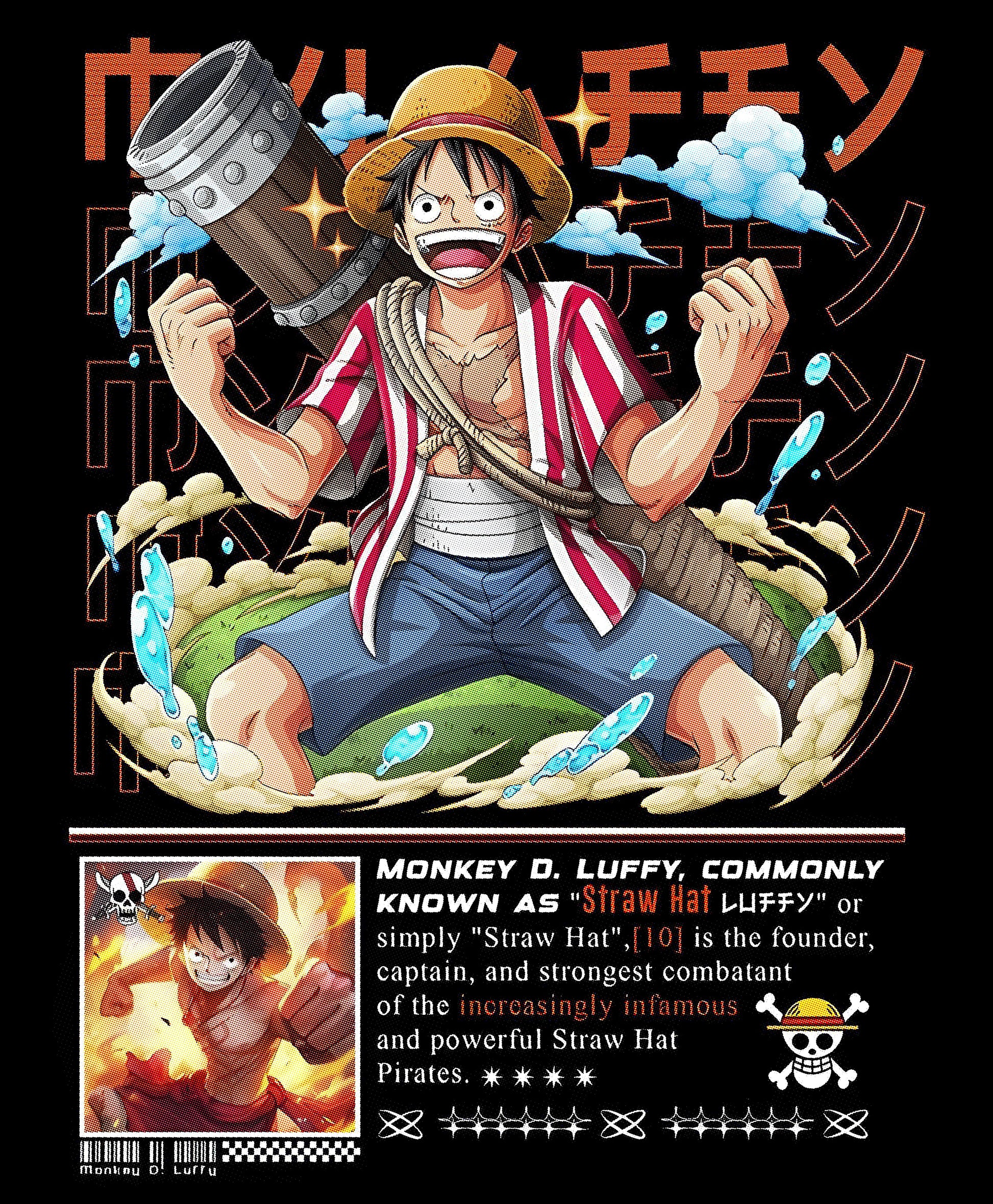 Description: Set sail with the aspiring Pirate King with our Monkey D. Luffy One Piece apparel, available as a t-shirt, hoodie, or crewneck. This exuberant design features Luffy in full action, hammer in hand and a playful expression, captured in bold, vibrant colors against a dark backdrop. It's the perfect pick for fans of the epic saga.