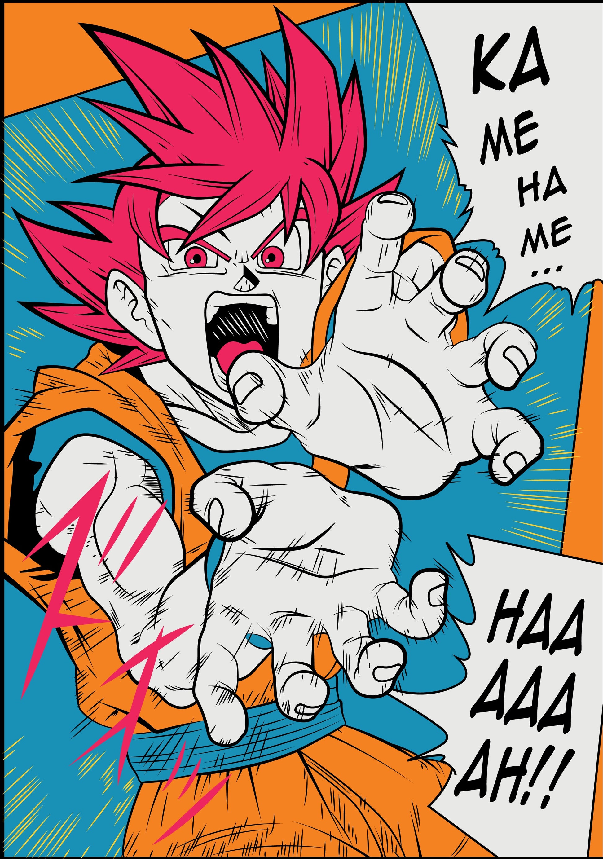 Unleash the power of Super Saiyan God with our Dragon Ball Super Goku apparel. This electrifying design features Goku in mid-action, unleashing his iconic Kamehameha wave. The vibrant clash of orange and pink highlights against a pop art-style background makes this piece a must-have for any Dragon Ball enthusiast.