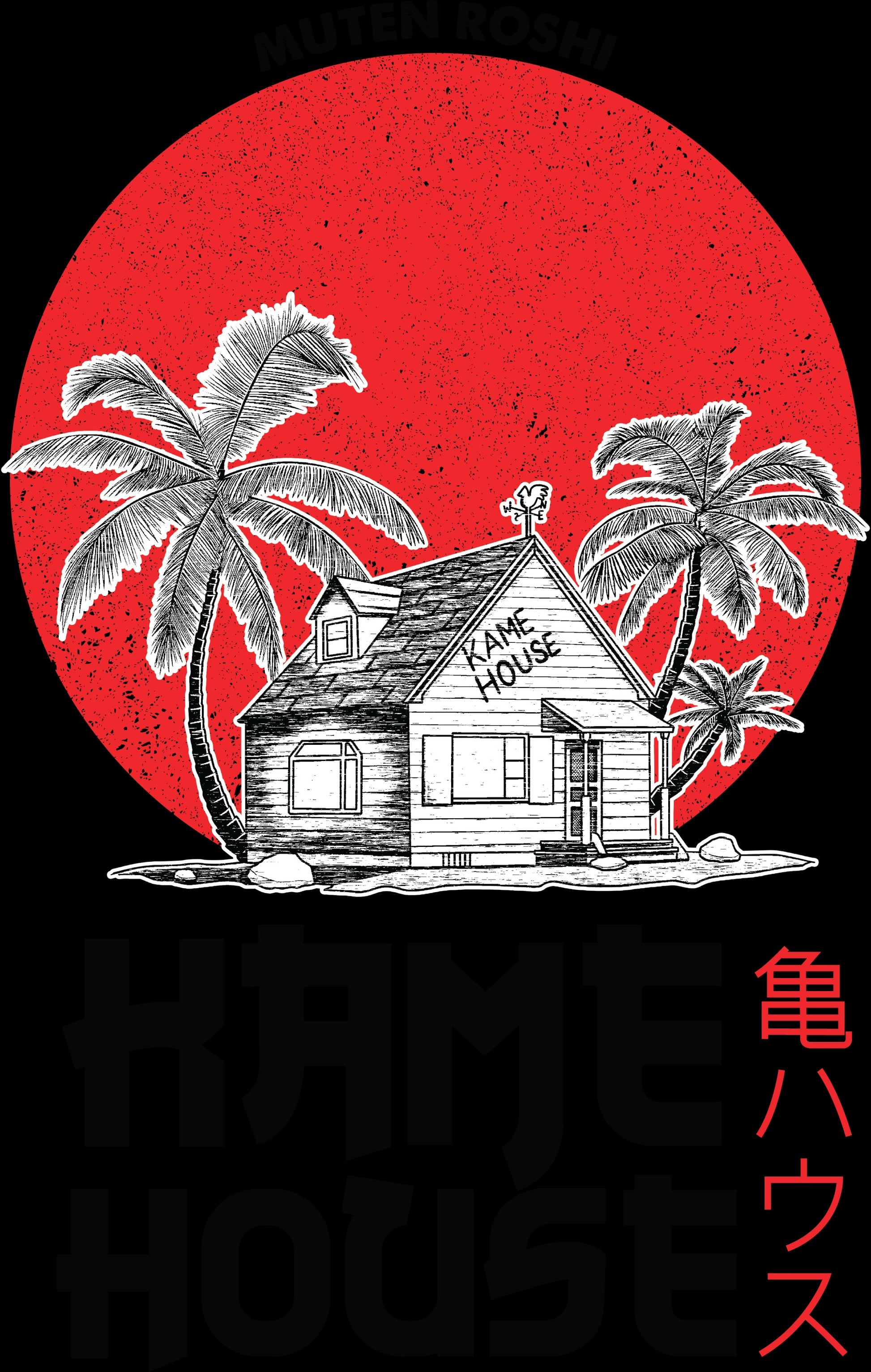 Description: Escape to the iconic Kame House with our exclusive Dragon Ball apparel. This design features the tranquil island home of Master Roshi, set against a striking red sun and silhouetted palm trees, capturing the essence of serene training days from the beloved series.