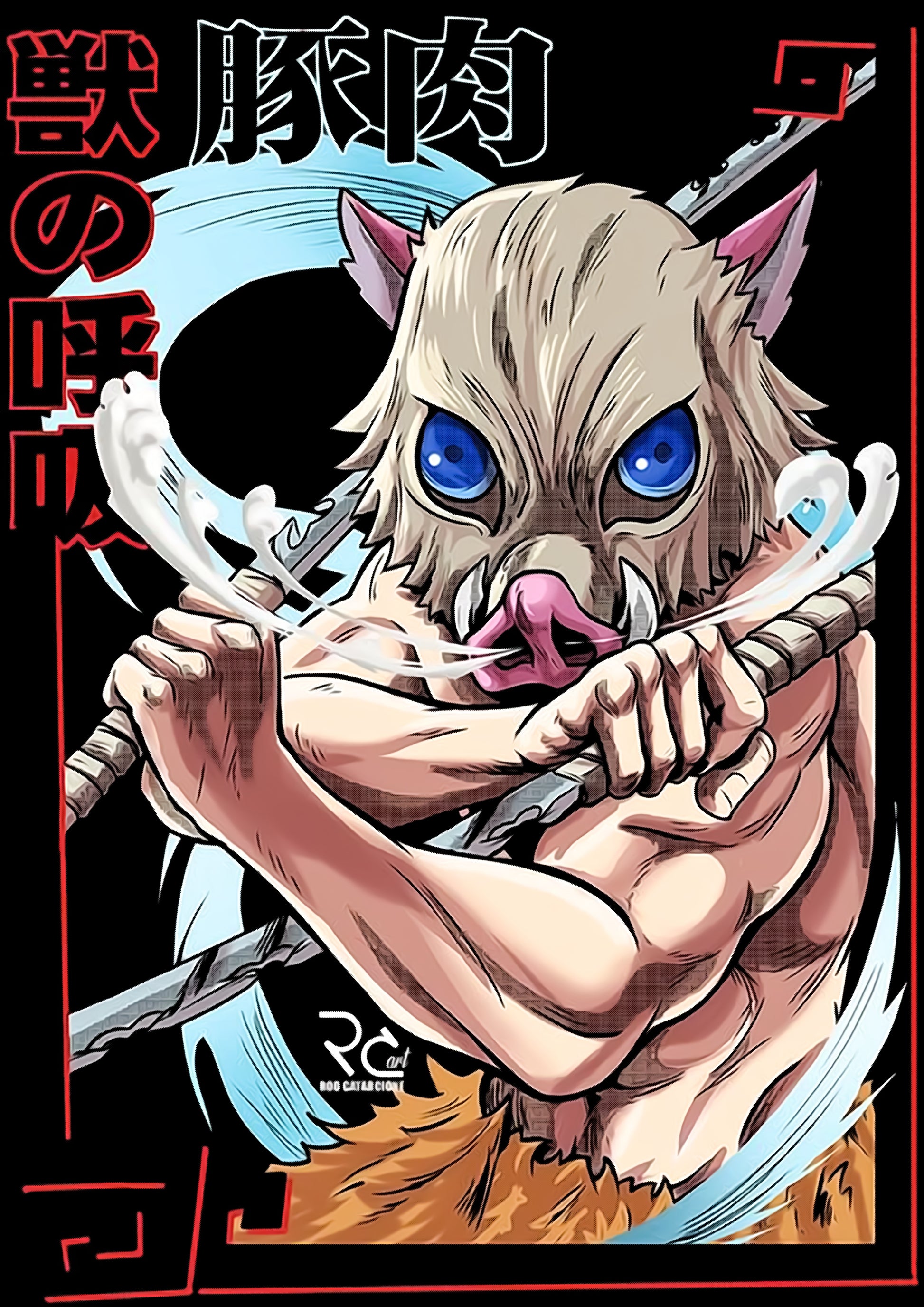 Description: Unleash your wild side with our Inosuke Hashibira apparel from "Demon Slayer." This vibrant design captures Inosuke's fierce and untamed spirit, portrayed with his characteristic boar mask and dual swords in a dynamic pose. The background features traditional Japanese kanji that complements the energy and raw power of his character.