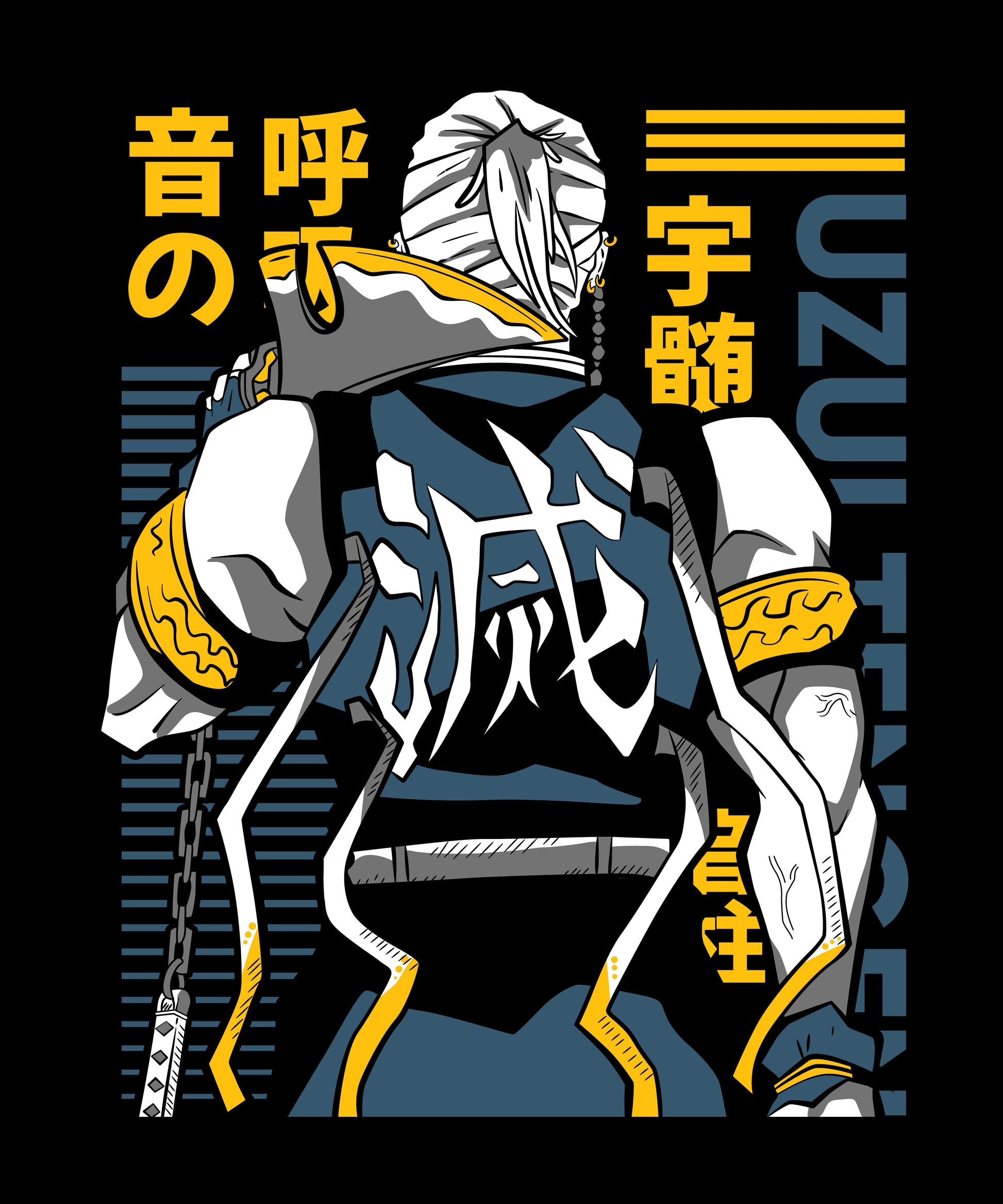 Description: Embrace the flamboyant style and unmatched charisma of the Sound Hashira, Tengen Uzui, with this bold design. Featuring Uzui's striking back pose adorned with intricate details of his uniform, this piece highlights his unique dual-sword combat style and confident personality. The vibrant yellow and blue accents along with Japanese text add an electrifying touch, making it a standout for fans of Demon Slayer: Kimetsu no Yaiba.