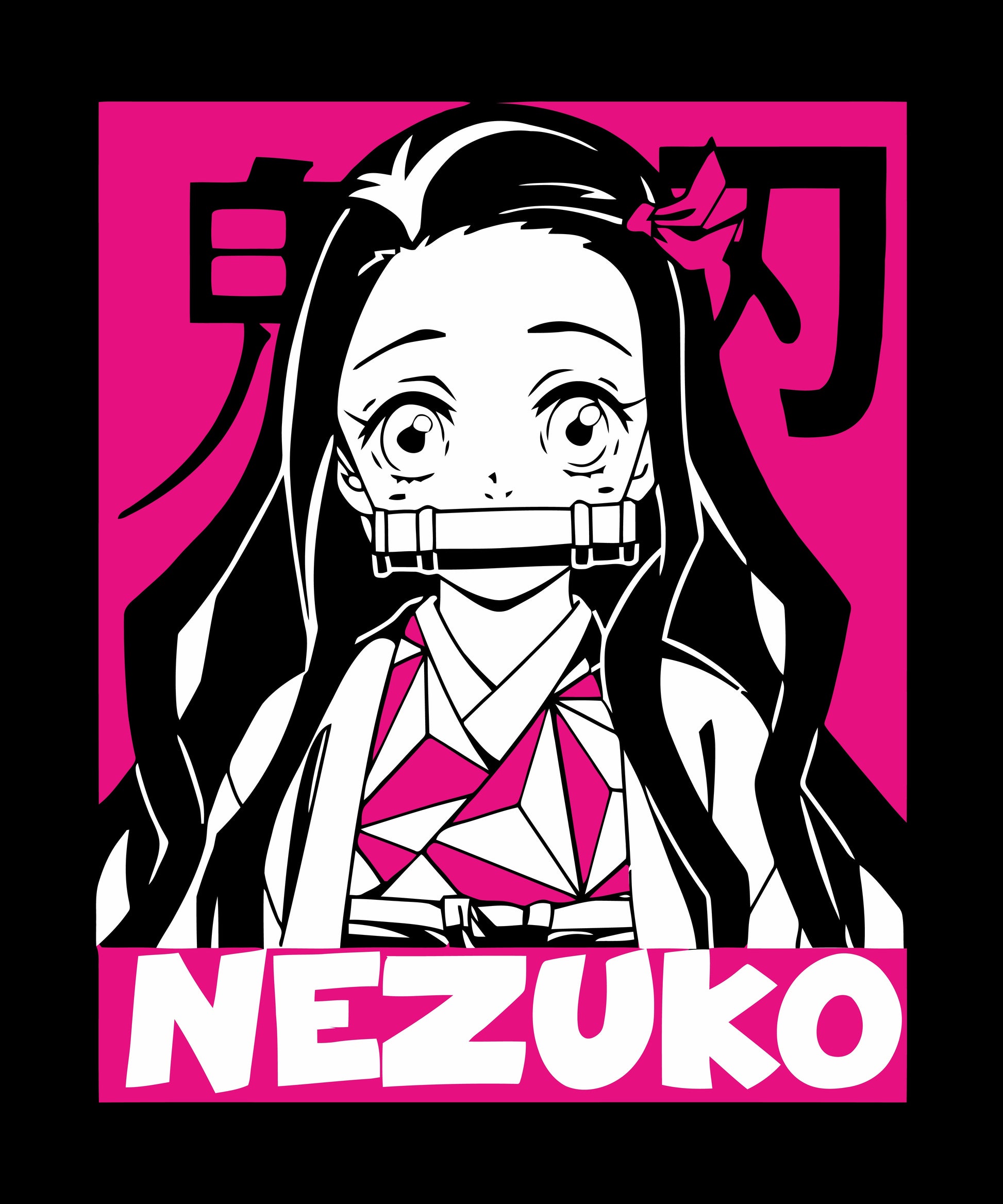 Description: Celebrate the beloved demon-turned-hero, Nezuko Kamado, with this vibrant design featuring her iconic look highlighted in bold pink and black tones. This artwork captures her gentle yet fierce essence, perfect for fans who admire her strength and loyalty in Demon Slayer: Kimetsu no Yaiba.