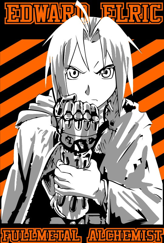 Description: Channel the alchemical genius of Edward Elric with this striking design inspired by Fullmetal Alchemist. Featuring a bold silhouette of the Fullmetal Alchemist himself, highlighted in vibrant orange and gray tones, this piece captures Edward's unwavering determination and relentless pursuit of truth. Perfect for fans who admire the iconic alchemist's journey and spirit.