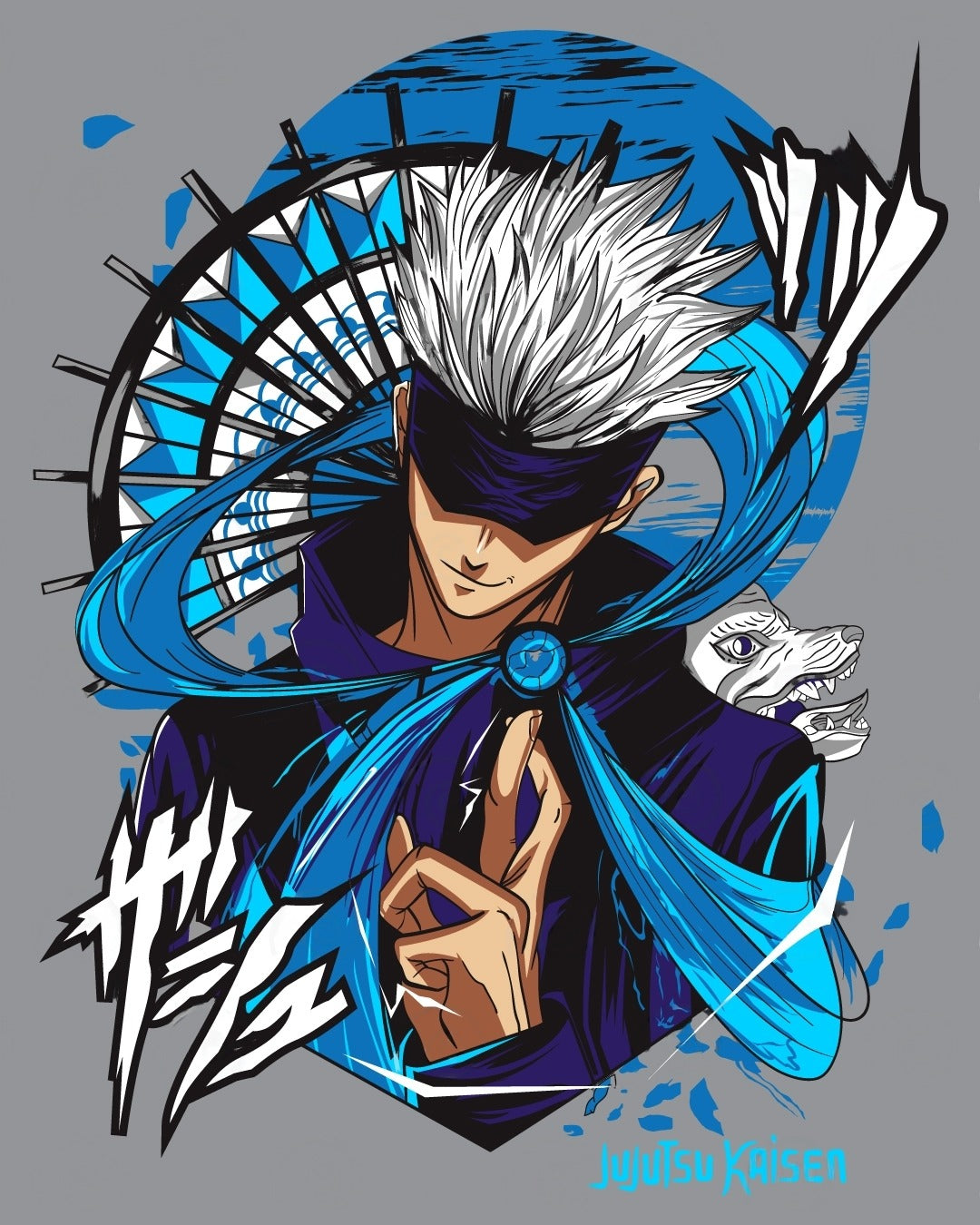 Celebrate the boundless power of Gojo Satoru from Jujutsu Kaisen with this eye-catching design. Featuring Gojo in his iconic blindfold with his signature blue Infinity glow, the artwork encapsulates his enigmatic charm and overwhelming strength. The swirling blue accents and sharp details highlight his mastery of cursed techniques.