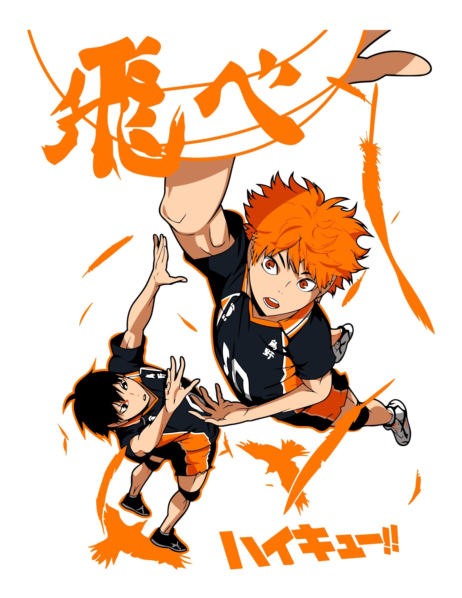 Celebrate the dynamic duo from Haikyuu!!—Hinata Shoyo, the "Tiny Giant," and Kageyama Tobio, the "King of the Court"—with this electrifying design. The illustration showcases the pair in mid-air, perfectly timed for one of their iconic quick attacks. The vibrant orange and black of Karasuno’s team colors pop against the clean white background, with bold Japanese kanji for “Fly” (飛べ) and the Haikyuu!! logo anchoring the design.