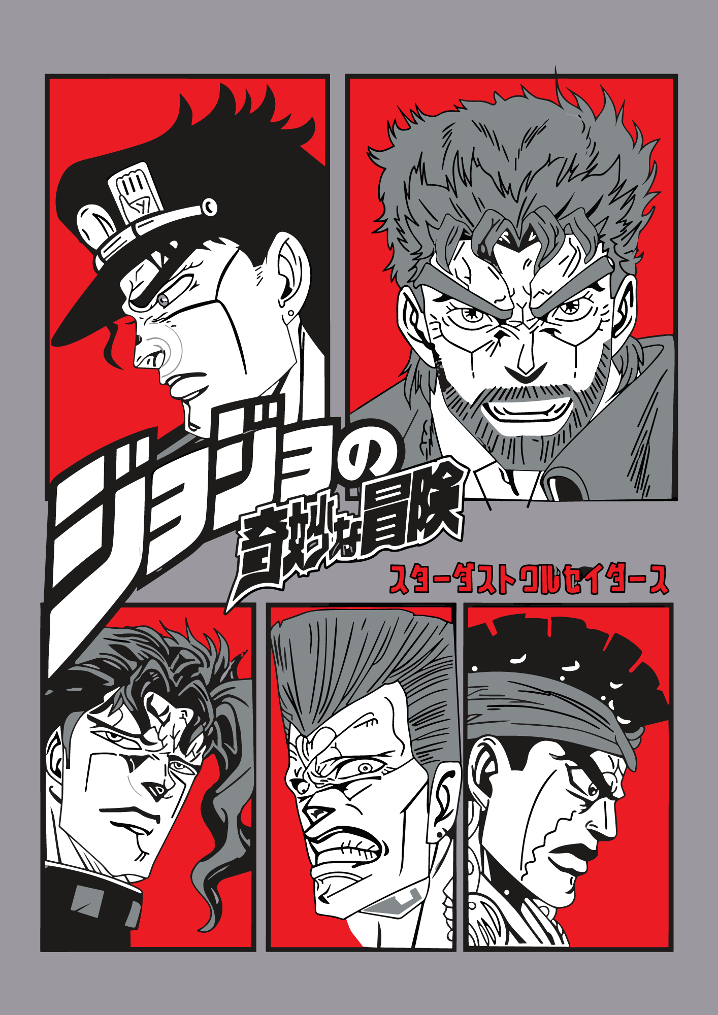 Celebrate the iconic Stardust Crusaders with this bold and striking design featuring Jotaro Kujo, Joseph Joestar, Noriaki Kakyoin, Jean Pierre Polnareff, and Muhammad Avdol. Each character is captured in a dynamic panel-style layout, framed against a vivid red background that highlights their unique personalities and determination. The bold Japanese text enhances the authentic JoJo aesthetic.