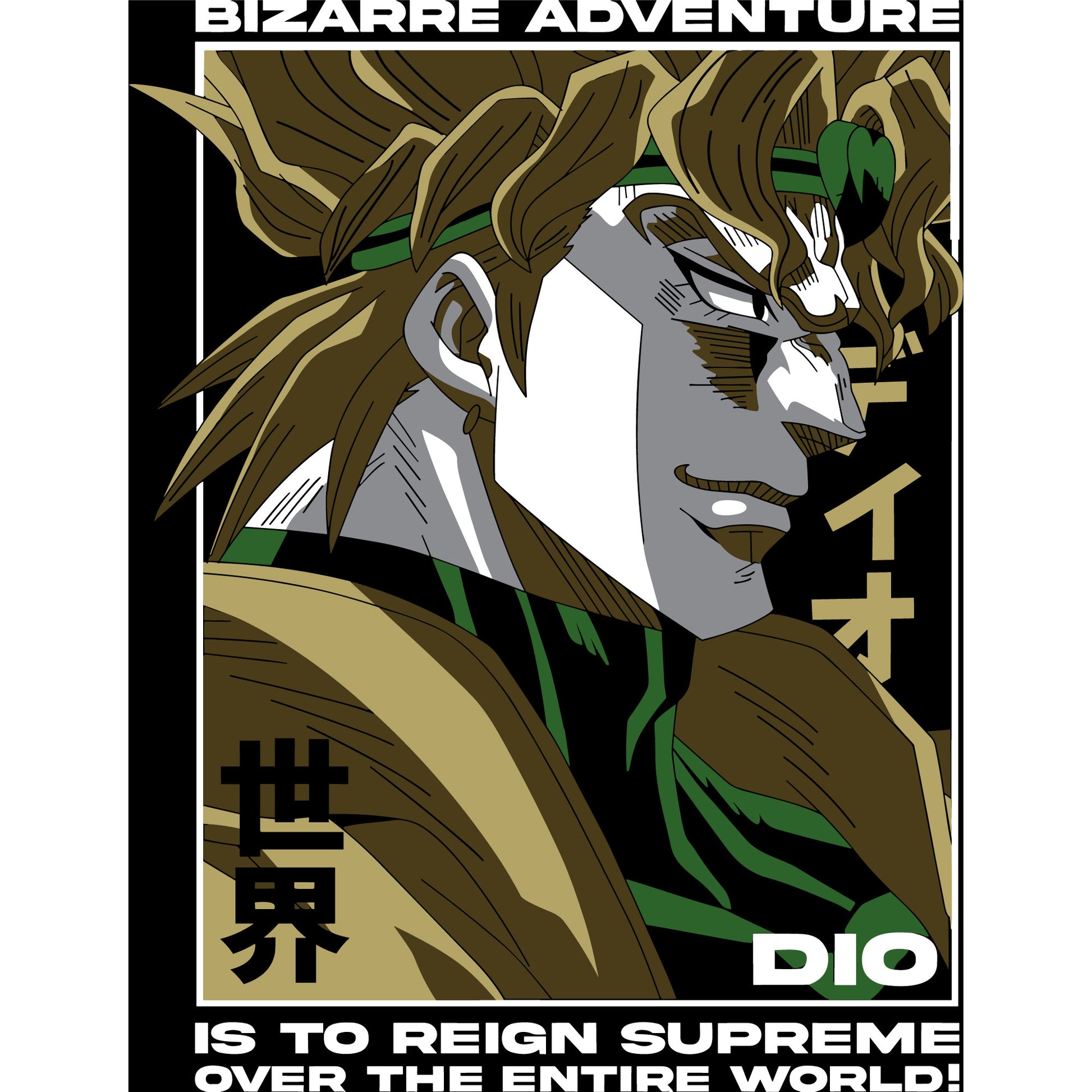 Showcase the menace and charisma of DIO, the legendary antagonist of JoJo's Bizarre Adventure, with this stunning artwork. The design captures DIO’s sharp features and commanding presence, accented with shades of gold, green, and black that echo his iconic attire. Bold text emphasizes his ambition: “To Reign Supreme Over the Entire World!” with a sleek Japanese kanji for "World" (Sekai), further adding to its dramatic flair.