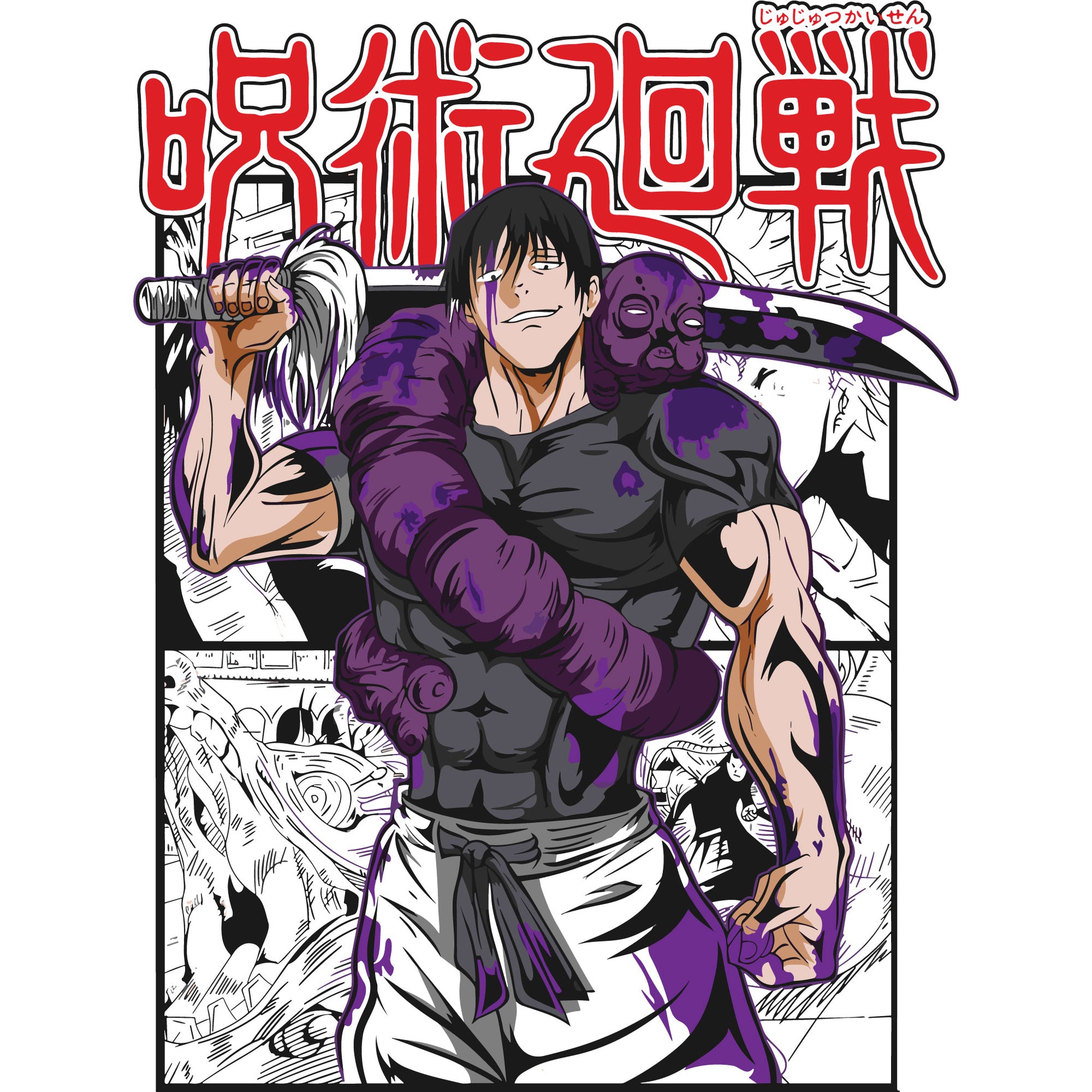 This striking artwork features Toji Fushiguro, the "Sorcerer Killer" from Jujutsu Kaisen, in his menacing glory. His imposing physique and signature weapon, the inverted spear of heaven, are showcased in vivid detail, surrounded by cursed energy in a purple hue. The background highlights manga panel details, complementing the bold red Japanese kanji for Jujutsu Kaisen at the top, giving it an authentic and dynamic aesthetic.
