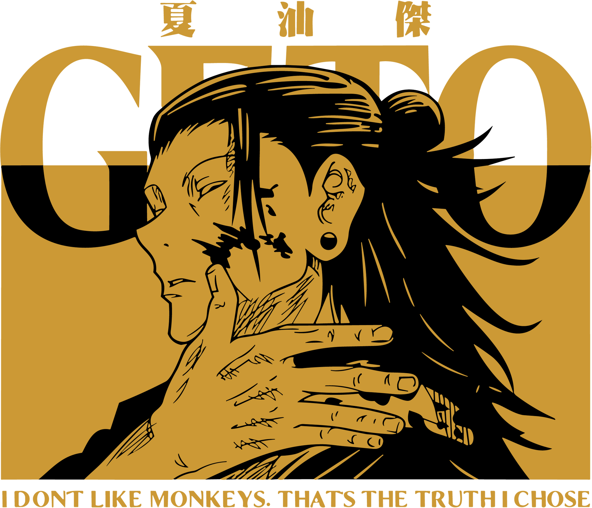 This captivating artwork showcases Suguru Geto, the enigmatic antagonist from Jujutsu Kaisen, in a bold and minimalist design. His side profile emphasizes his iconic facial scars and calm yet intimidating demeanor, while his hand gesture adds a dramatic flair. The golden Japanese kanji for his name, "夏油傑," elegantly frames the top, while the oversized "GETO" text in the background enhances the composition. The striking quote, "I don’t like monkeys. That’s the truth I chose," at the bottom encapsulates his philosophy, making this design both stylish and meaningful.