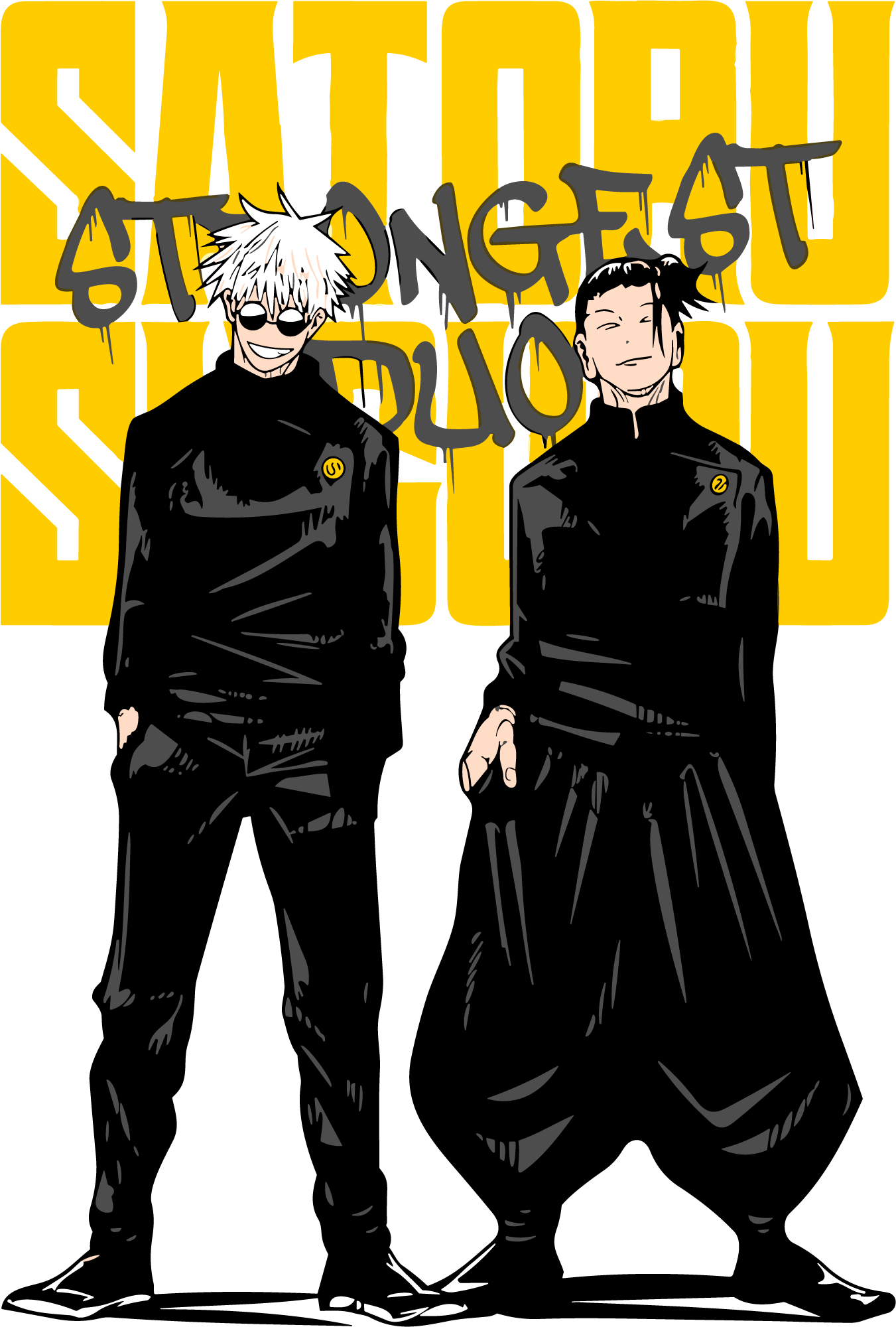 This dynamic artwork showcases Satoru Gojo and Suguru Geto, the "Strongest Duo" from Jujutsu Kaisen, in their youthful prime. Both characters are depicted in their black uniforms with vibrant details. Gojo exudes confidence with his signature smile and sunglasses, while Geto stands composed and charismatic. The bold yellow background text contrasts with their black attire, enhancing the overall powerful aesthetic of the design. The graffiti-style "Strongest Duo" lettering adds a modern, edgy vibe.