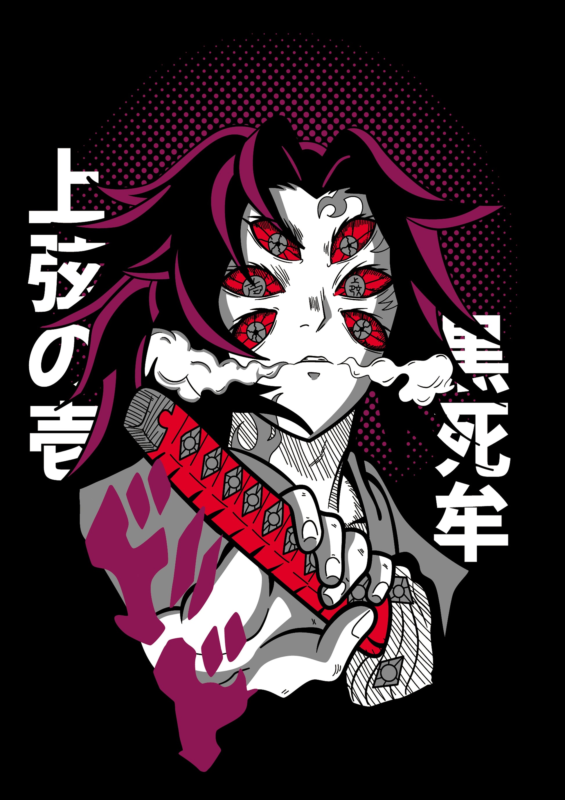 This captivating design features Kokushibo, Upper Moon One from Demon Slayer: Kimetsu no Yaiba. His piercing six eyes, vibrant red katana, and flowing purple hair create a menacing and powerful visual. The bold Japanese text alongside halftone background details accentuates Kokushibo's fearsome presence, making this design a standout tribute to one of the series' most iconic demons.