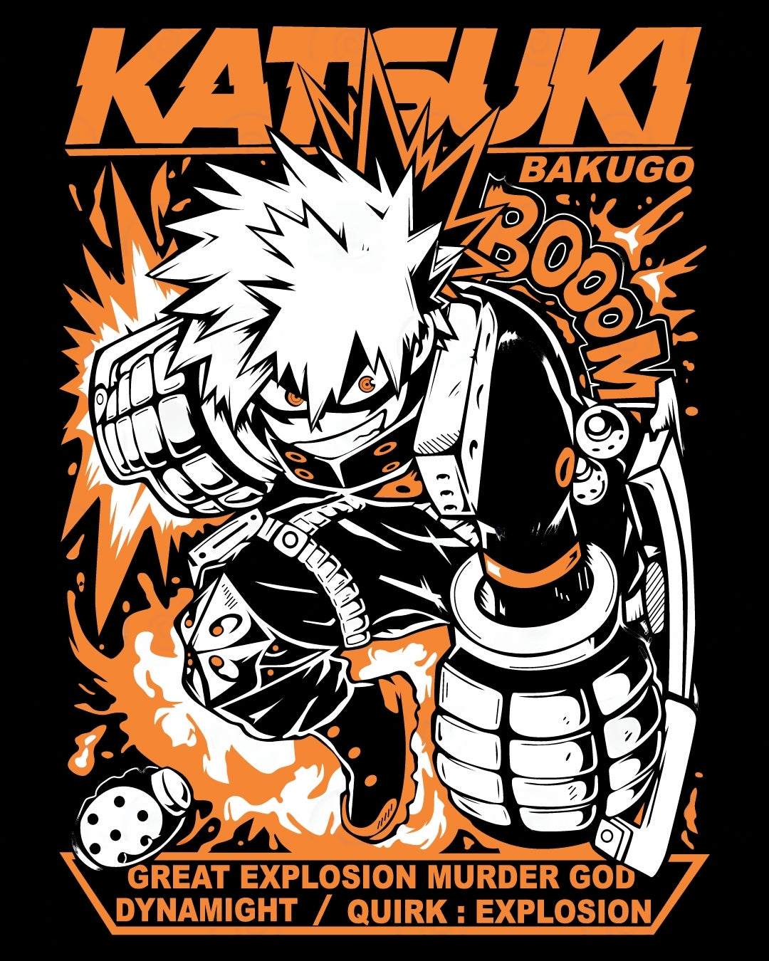 This explosive artwork captures Katsuki Bakugo, also known as "Great Explosion Murder God Dynamight," from My Hero Academia. His dynamic pose is surrounded by bursts of fiery orange energy, emphasizing his Quirk: Explosion. The bold "BOOOM" text and sharp details enhance the character's intensity, set against a black background for maximum impact.
