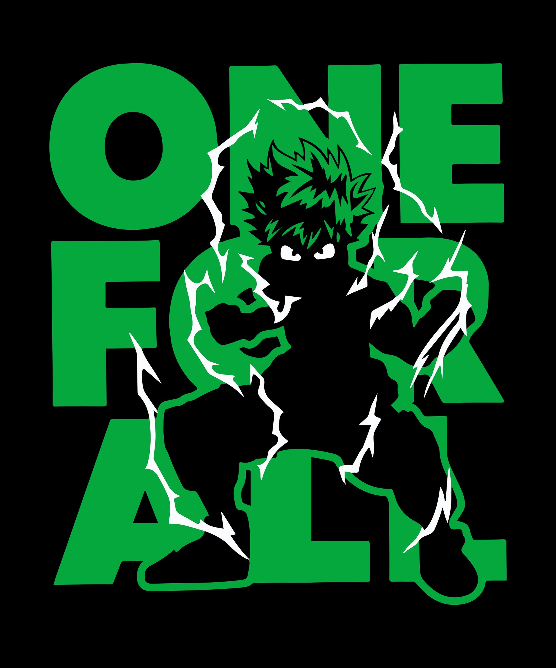 This bold and electrifying artwork showcases Izuku Midoriya, also known as Deku, harnessing the power of One For All. The minimalist silhouette is framed by striking green and white lightning bolts, creating a dynamic contrast against the large "ONE FOR ALL" text in the background. The design perfectly captures Deku’s determination and strength.