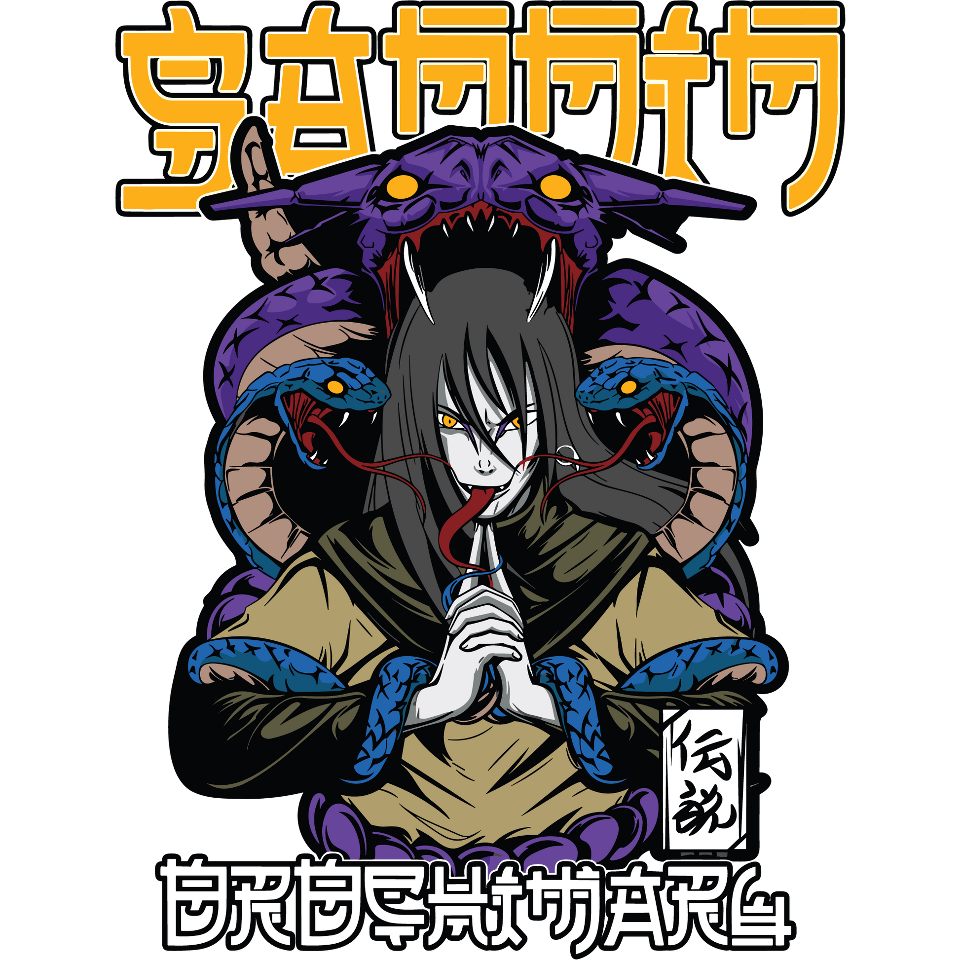 This bold and intricate design features Orochimaru, the legendary Sannin and iconic antagonist from the Naruto series. His sinister gaze, serpentine aura, and coiled snakes emphasize his power and menacing presence. The vivid purple and blue hues of the snakes contrast dramatically against Orochimaru's pale complexion, creating a visually captivating composition. The bold Japanese text adds a layer of authenticity to the design, making it a standout for fans.