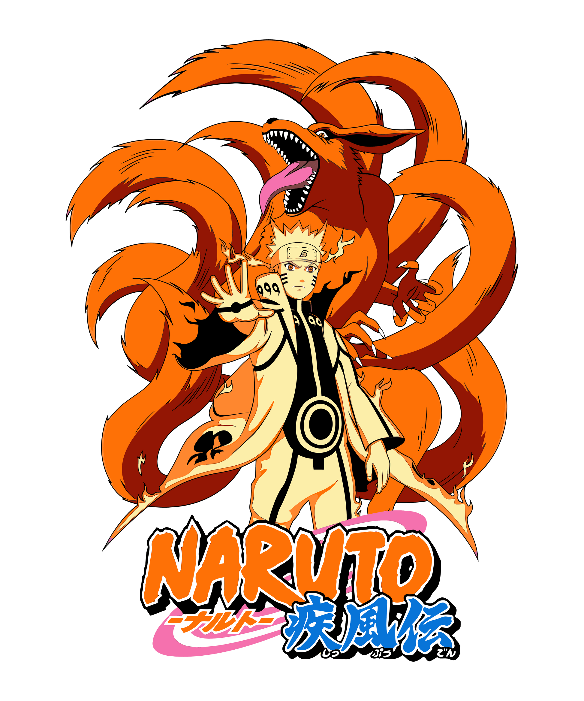 This stunning piece features Naruto Uzumaki standing proudly in his Sage of the Six Paths form, with the massive power of the Nine-Tails, Kurama, emerging behind him. The fiery orange chakra emanates from Naruto and Kurama, showcasing their powerful bond. Naruto's hand is outstretched, commanding the immense chakra as he prepares for battle. The bold and colorful "NARUTO" logo in the foreground adds to the dynamic look of the design. This artwork captures the essence of Naruto’s ultimate power and growth throughout the series.
