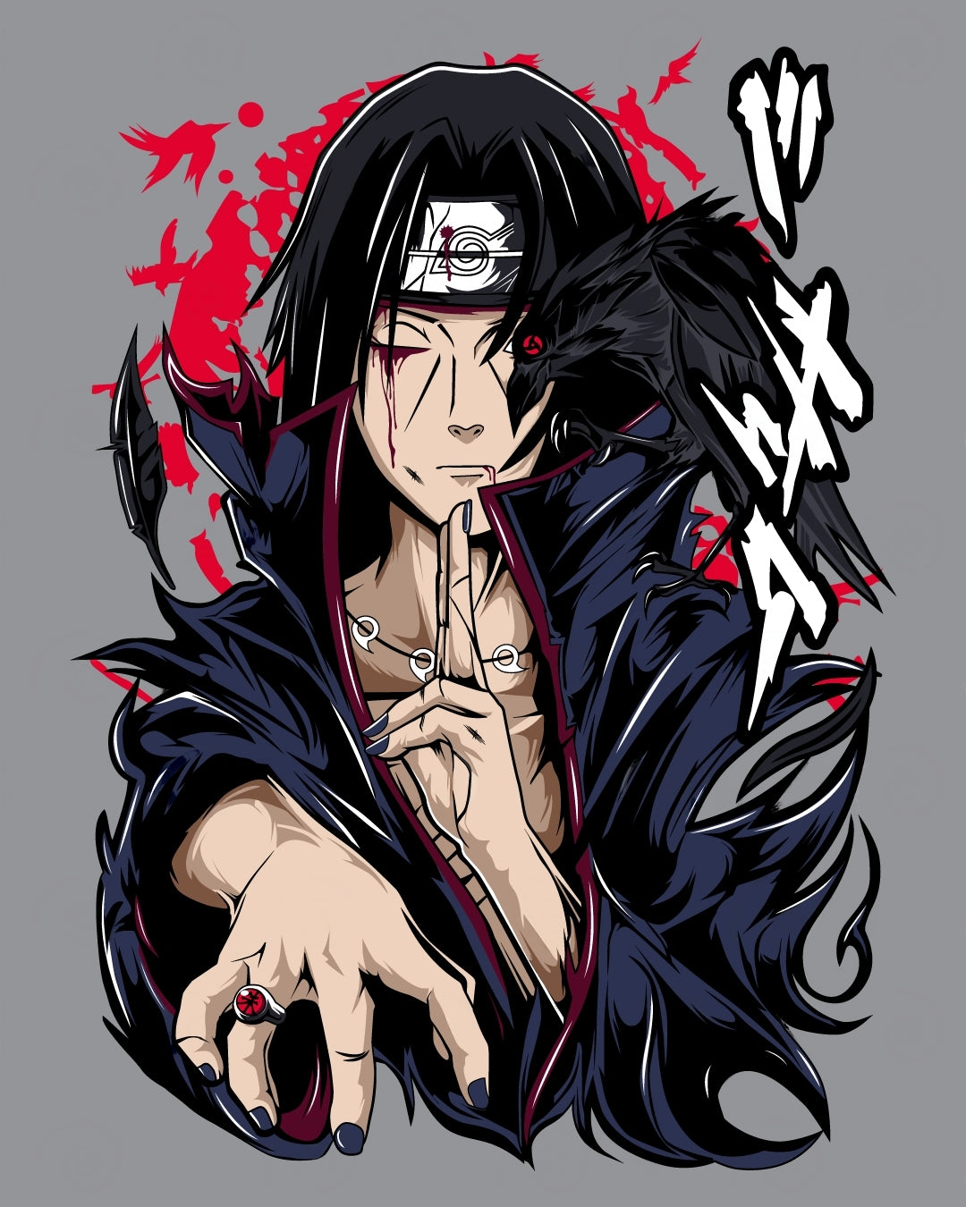 This captivating design features Itachi Uchiha, the enigmatic and tragic anti-hero from Naruto. Itachi is depicted with his signature Mangekyō Sharingan, wearing his Akatsuki cloak. He is shown with his fingers positioned for a genjutsu, symbolizing his mastery over illusions. A crow, associated with Itachi's techniques and mysterious past, sits perched on his shoulder. The red and black background amplifies the intensity of his presence, while the bold Japanese text captures the essence of his powerful character.