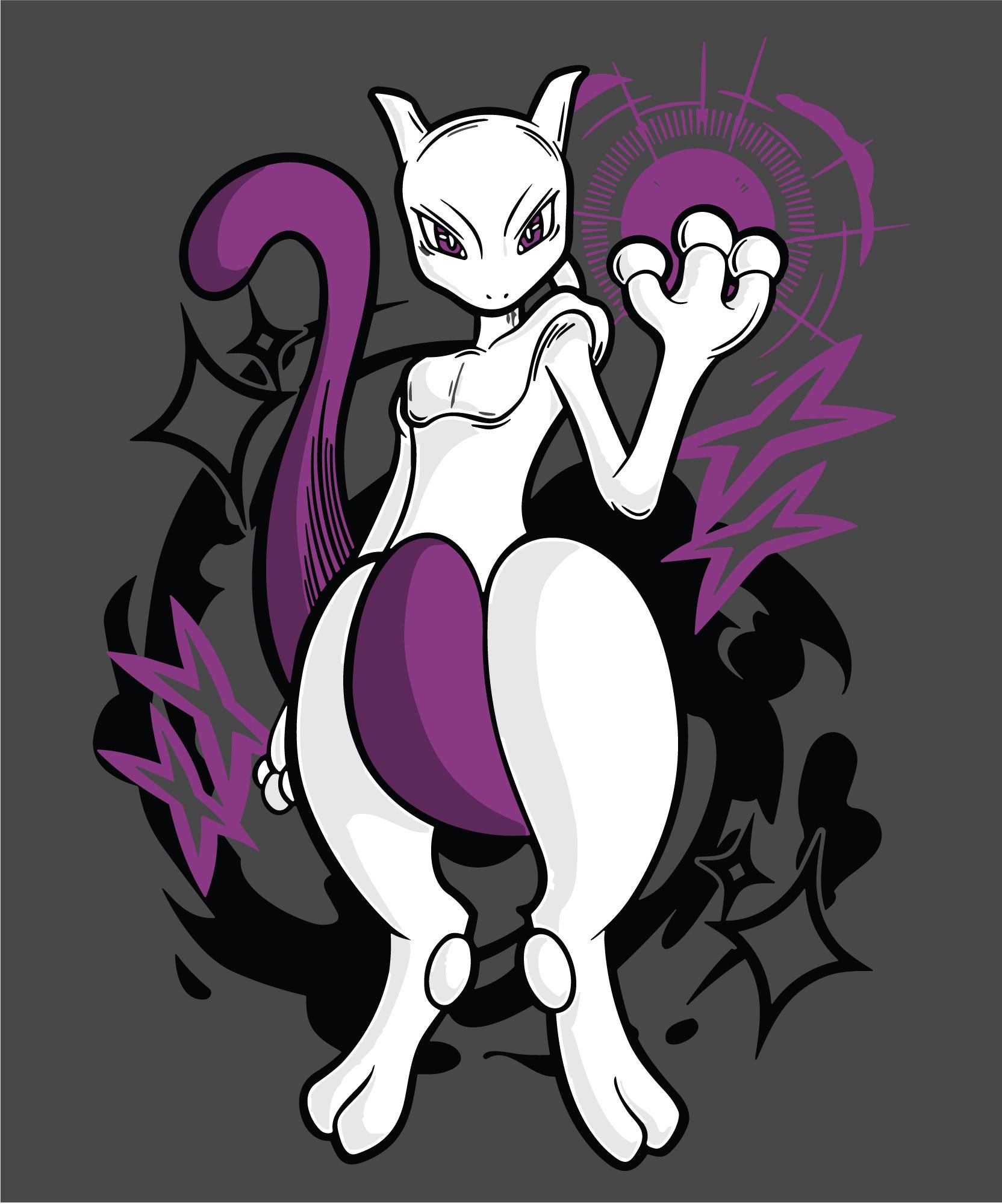 This striking design features Mewtwo, the legendary Psychic-type Pokémon, in its full glory. With its sleek white body and purple tail, Mewtwo exudes an aura of power and mystery. The design captures its formidable energy, surrounded by a dynamic burst of psychic energy and geometric shapes. Ideal for fans of this iconic Pokémon and anyone who appreciates Mewtwo's commanding presence in the Pokémon universe.