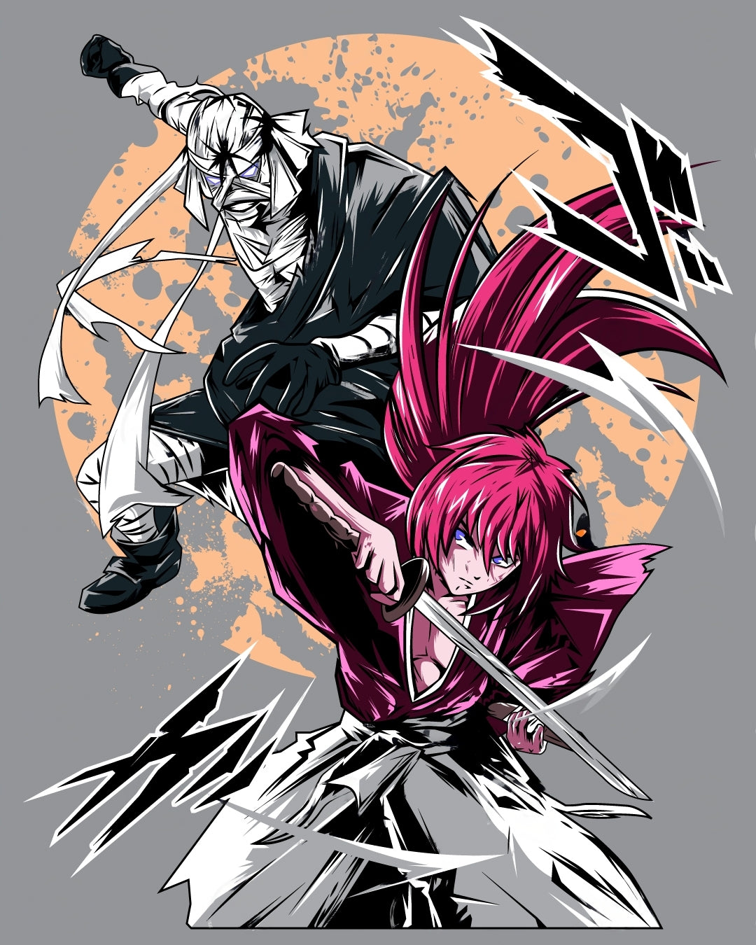 - Design: Features Kenshin and Kaoru in an action-packed stance with traditional Japanese-inspired artwork elements.