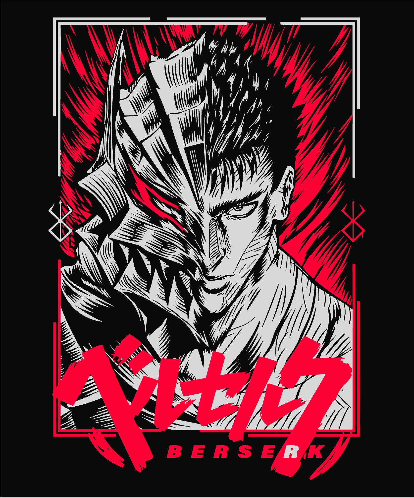 Description: Step into the fierce and formidable world of "Berserk" with our striking apparel featuring Guts, the Black Swordsman. This bold design showcases Guts in a dynamic pose, set against a vivid red backdrop, capturing the intense spirit of the series.