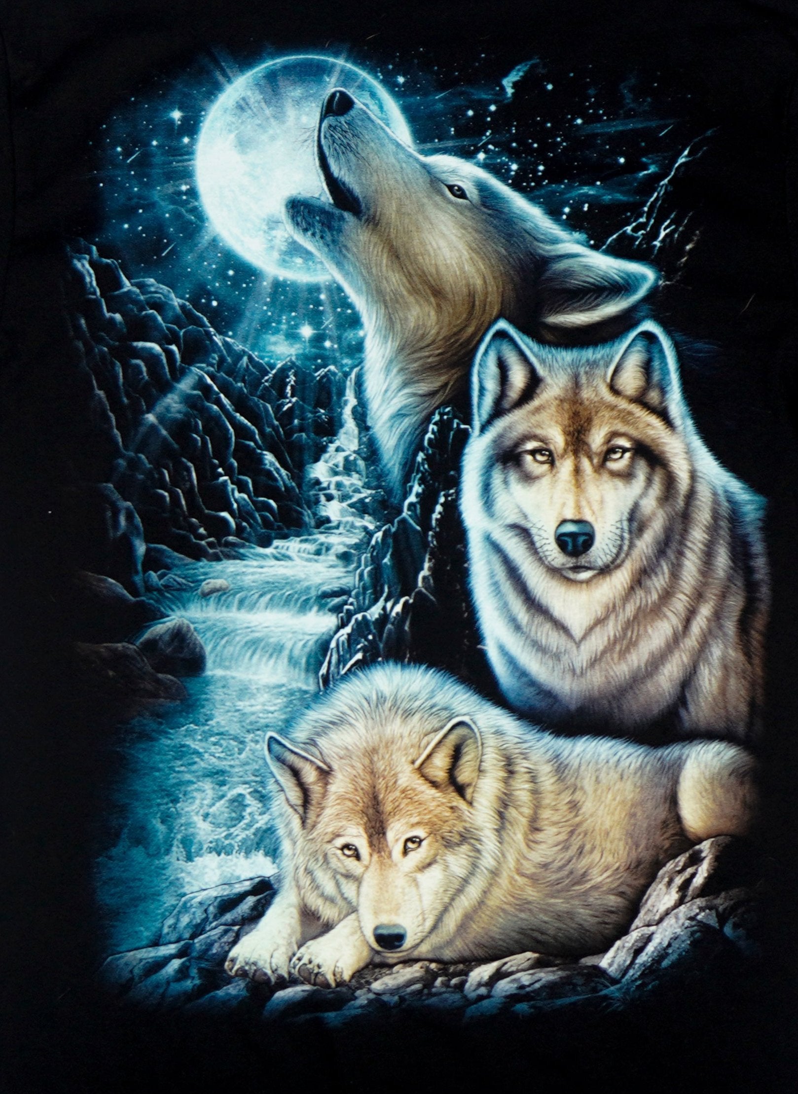 - Design: Detailed graphic of three wolves under a moonlit sky, with a backdrop of rocky terrain and starlit sky