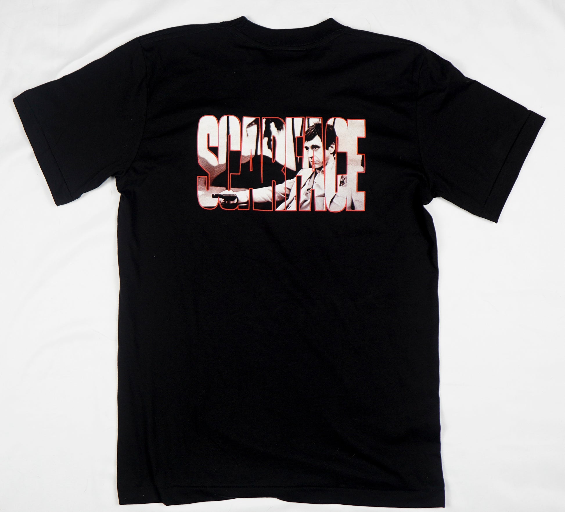 Channel the intense and iconic style of Tony Montana with our "Scarface" shirt. This bold design features a classic portrait of Al Pacino as the unforgettable character from the groundbreaking film, framed by the quote, "Who do I trust? I trust me." Made from 100% cotton, this shirt captures the essence of the movie's drama and Tony's relentless ambition.