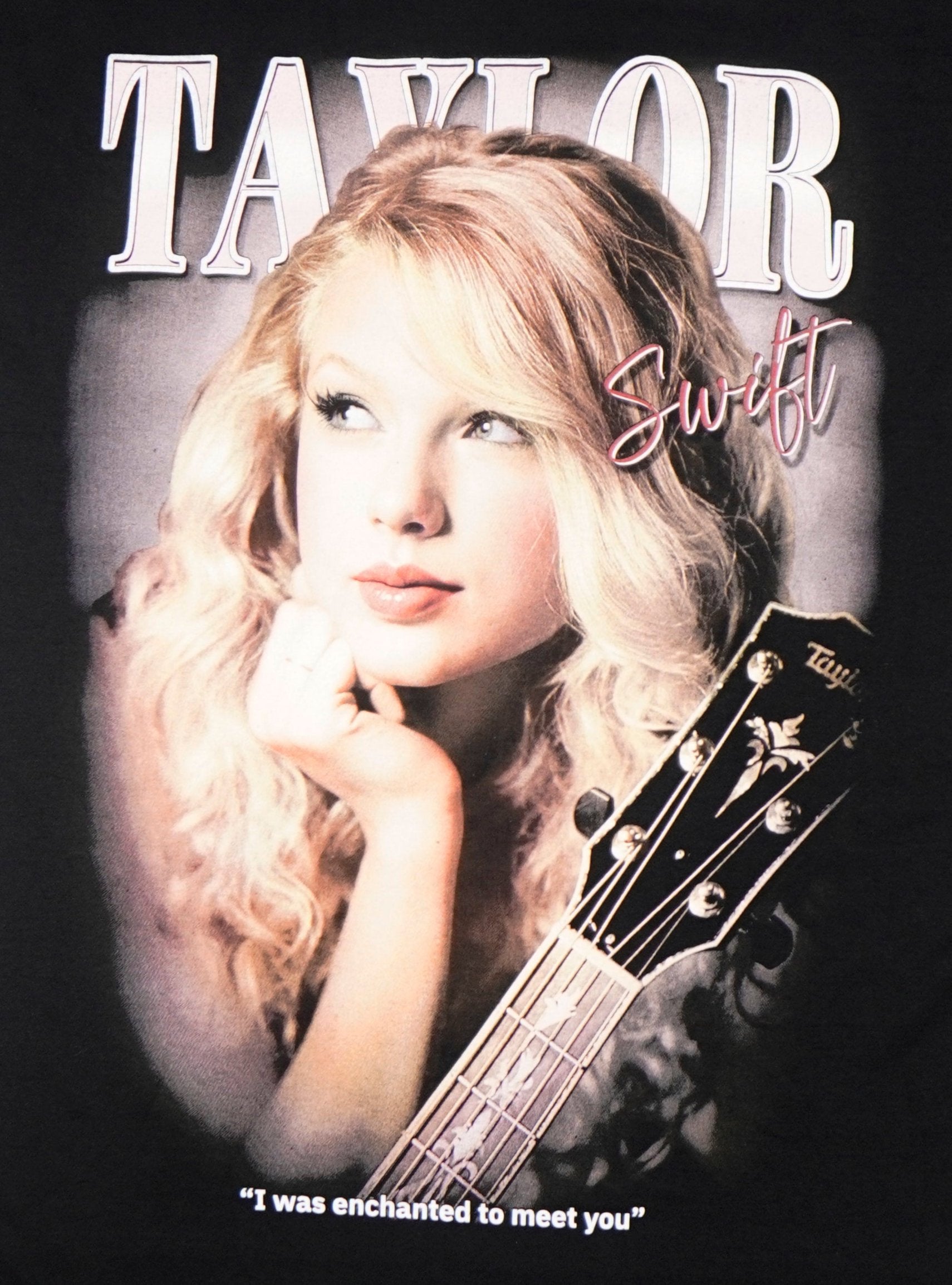 - Design: Elegant Taylor Swift portrait with script and glow-in-the-dark quote "I was enchanted to meet you"