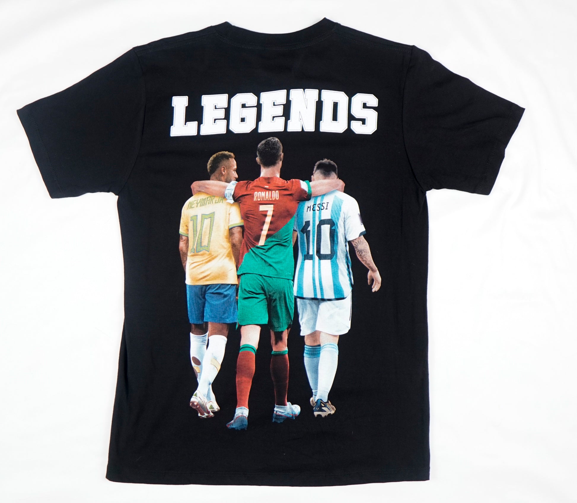 Celebrate football's finest with our glow-in-the-dark "Legends" shirt, featuring Neymar, Cristiano Ronaldo, and Lionel Messi. This special edition captures an iconic moment with three of the sport’s most celebrated players side by side, highlighted by the "LEGENDS" text that glows in the dark, adding an extraordinary touch. Made from 100% cotton, this shirt combines comfort with the thrill of the game.