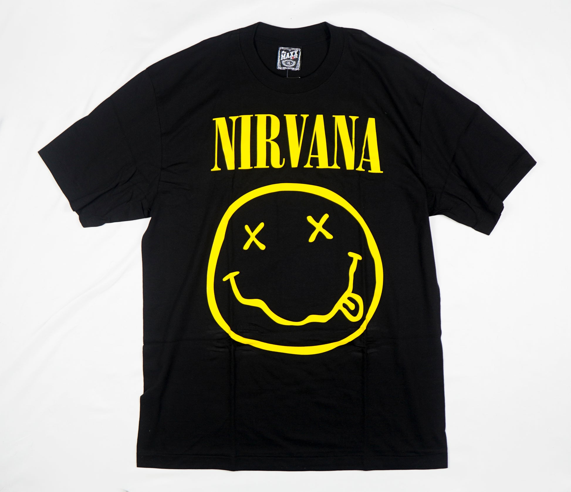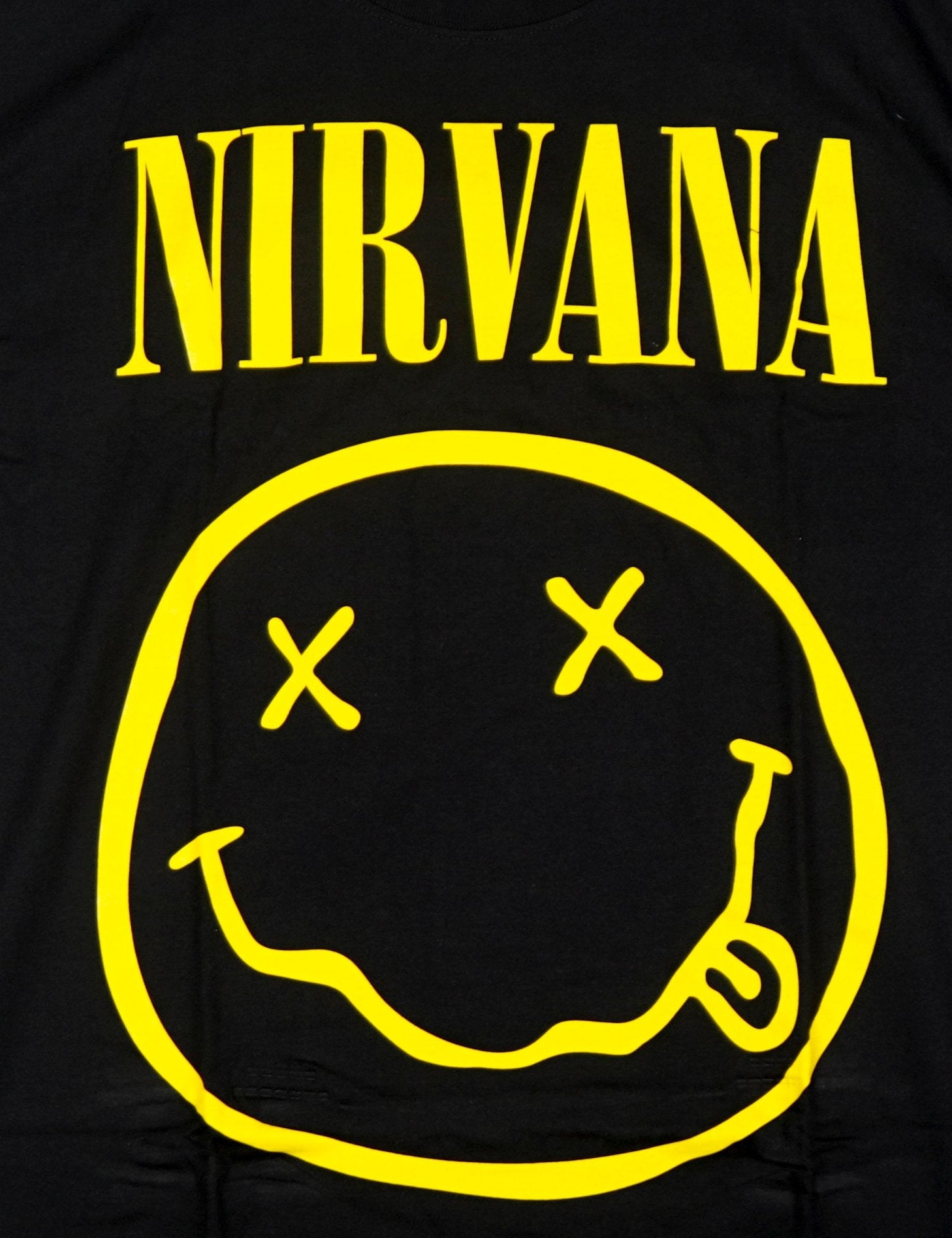 Capture the spirit of the grunge era with our Nirvana Smiley Face logo shirt. This iconic design features the band's famous smiley face emblem in bold yellow, set against a stark black background, making a striking visual statement. Made from 100% cotton, this shirt is as comfortable as it is iconic.